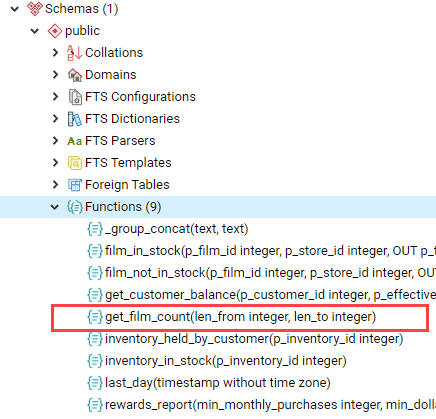 (1 row)In this example, the arguments of the get_film_count() are 40 and 90 that corresponds to the from_len and to_len parameters.